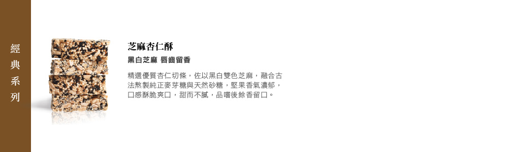 精選優質杏仁切條,佐以黑白雙色芝麻,融合古法熬製純正麥芽糖與天然砂糖,